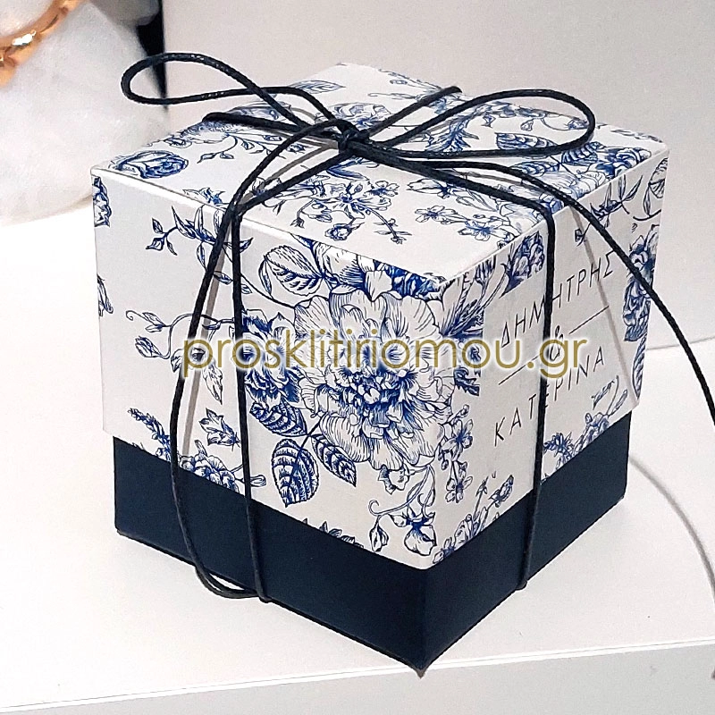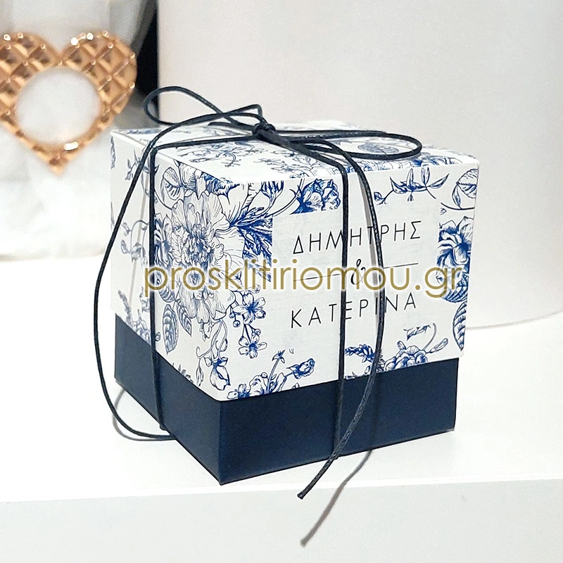 Μπομπονιερα γάμου κουτί χάρτινο με λουλούδια με εκτύπωση ονομάτων. Η τιμή αφορά σε ολοκληρωμένη μπομπονιέρα με 5 κουφέτα αμυγδάλου.
