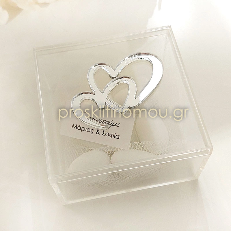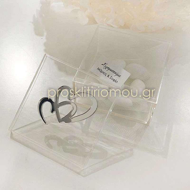 Μπομπονιέρα γάμου κουτί πλεξιγκλας με καρδιές. Εσωτερικά καρτάκι γάμου ευχαριστήριο, εκτυπωμένο με τα ονόματά του ζεύγους. Η τιμή αφορά σε ολοκληρωμένη μπομπονιέρα με 5 κουφέτα Χατζηγιαννάκη.