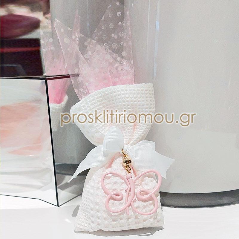 Luxury Μπομπονιερα πεταλούδα με ροζ με χρυσες λεπτομέρειες (χάντρα επιχρυσωμένη 24Κ) σε υγασμάτινο ανάγλυφο πουγκί με τούλι ροζ εσωτερικά. Διάσταση: 15χ10εκ. Ελάχιστη παραγγελία 80 τεμάχια.