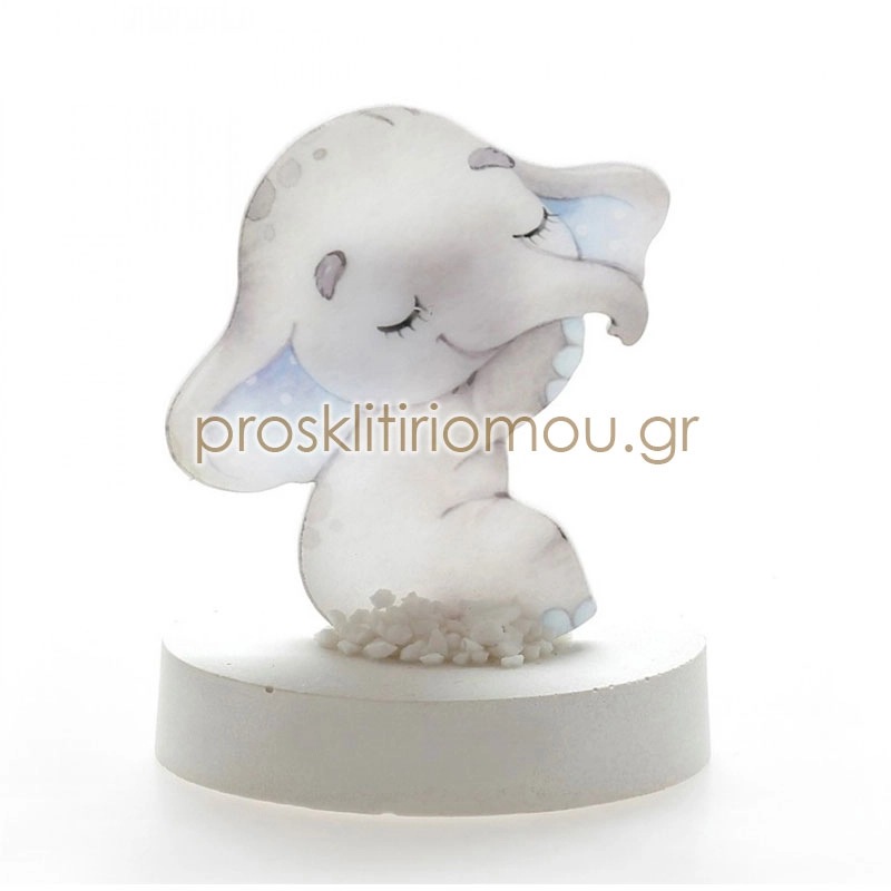 Μπομπονιέρα βαπτισης γαλάζιο ελεφαντακι σε αρωματική βάση. Διάσταση: 8Χ10 εκ. Η τιμή αφορά ολοκληρωμένη μπομπονιέρα με 5 κουφέτα Χατζηγιαννακη. Ελάχιστη παραγγελία 50 τεμάχια.