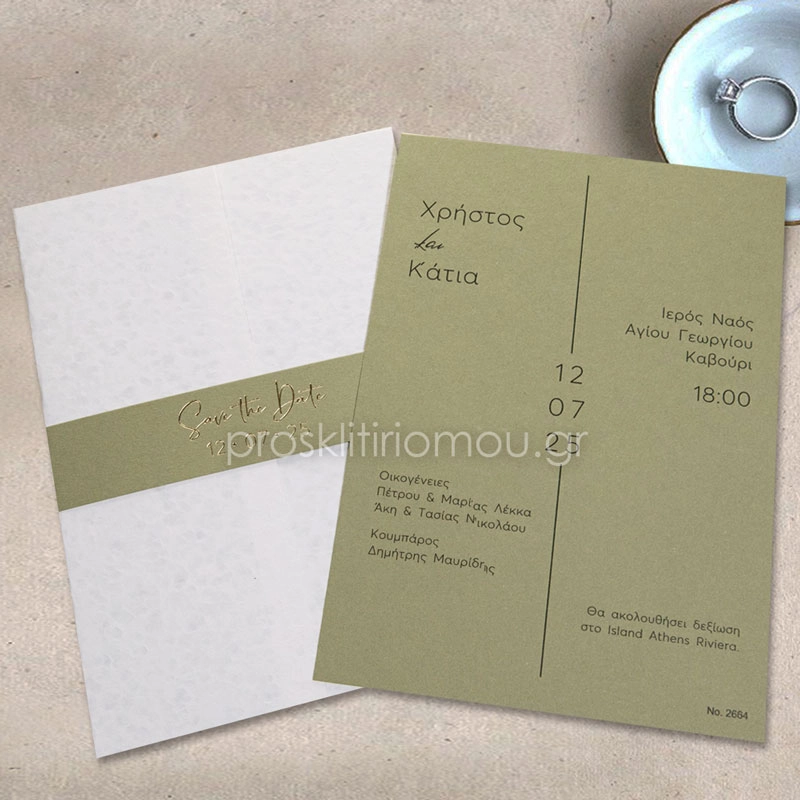 Προσκλητήριο 2664. Ένα υπέροχο προσκλητήριο σε λαδί αποχρώσεις. Ο φάκελος, είναι από λευκό χαρτί με ιδιαίτερη υφή και κλείνει με χάρτινη τρέσα στο χρώμα της πρόσκλησης. Η εσωτερική κάρτα είναι σε mat χαρτί 300γρ. σε λαδί απόχρωση. Η διάσταση του προσκλητηρίου είναι 23x16cm.