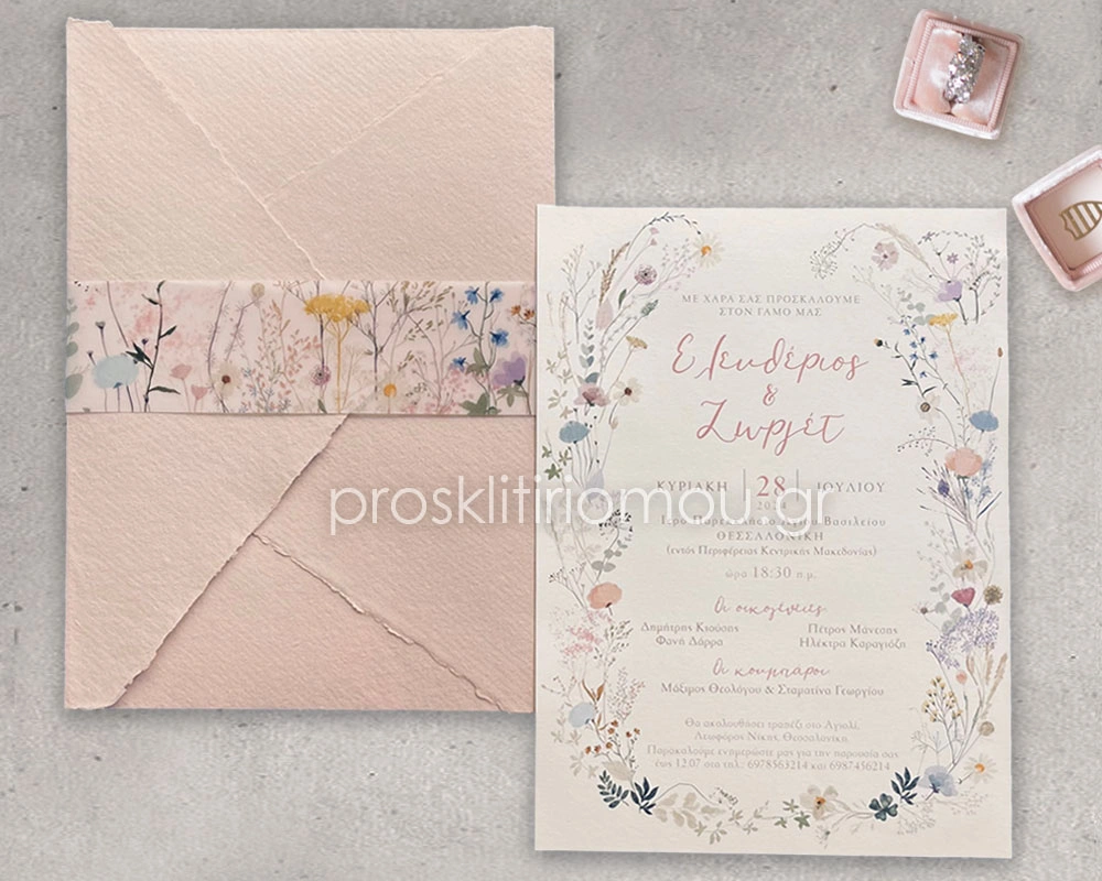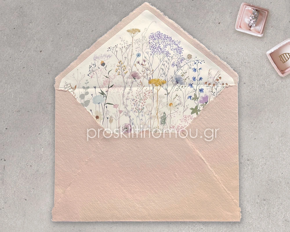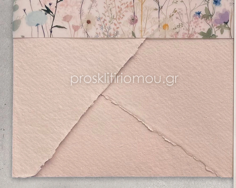 Προσκλητήριο cotton paper με λουλούδια πολύχρωμα 7815. Η εσωτερική κάρτα είναι από ματ premium χαρτί με έγχρωμη εκτύπωση. Ο φάκελος είναι κατασκευασμένος από βαμβακερό χειροποίητο χαρτί, φέρει “φόδρα” εσωτερικά εκτυπωμένη με λουλούδια και σφραγίζει με λωρίδα ριζόχαρτο εκτυπωμένο στο ίδιο μοτίβο.