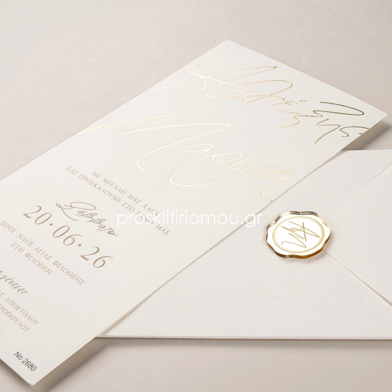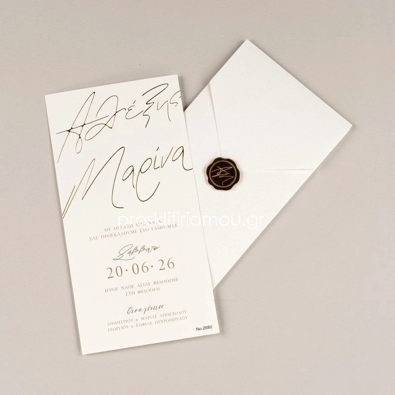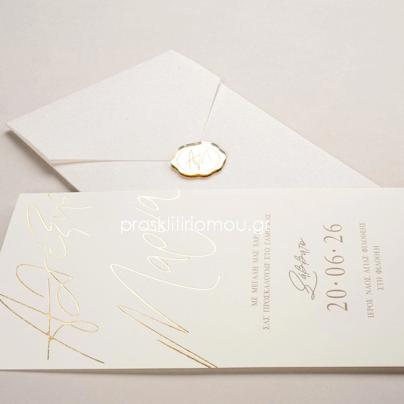 Στην τιμή περιλαμβάνεται το προσκλητήριο και ο φάκελος. Οι εκτυπώσεις και το βουλοκέρι Plexiglass χρεώνονται έξτρα (βλ. επιπρόσθετα).