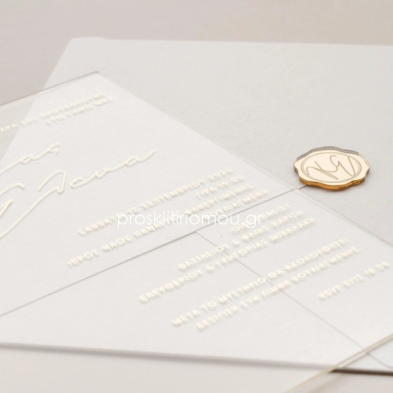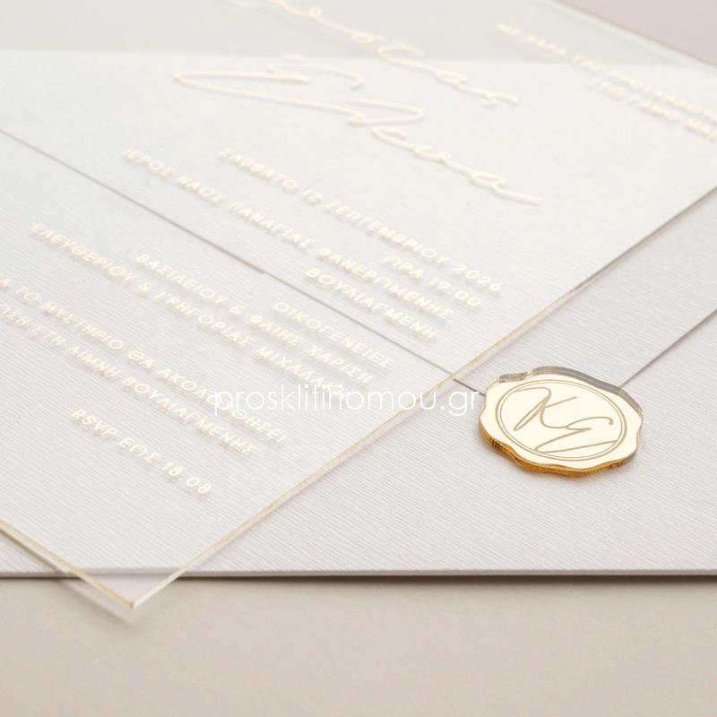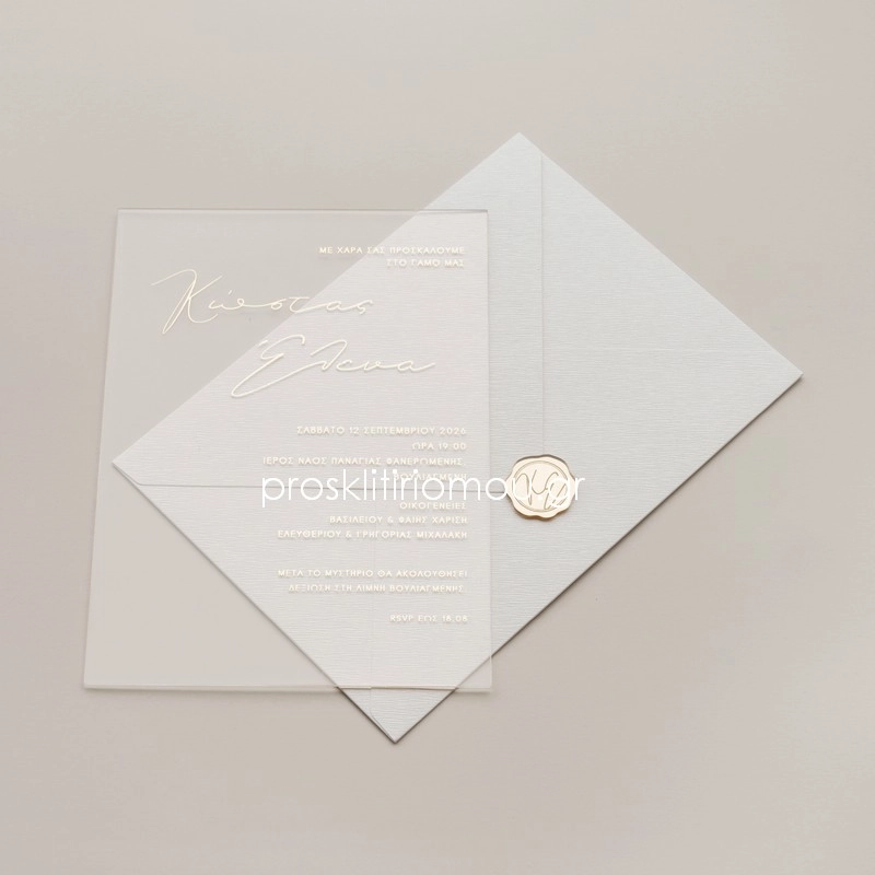 Προσκλητήριο γάμου πλεξιγκλας 2mm με χρυσοτυπία. Φάκελος: ανάγλυφο περλέ ιβουάρ χαρτί. Διάσταση: 24,5×17,5cm.