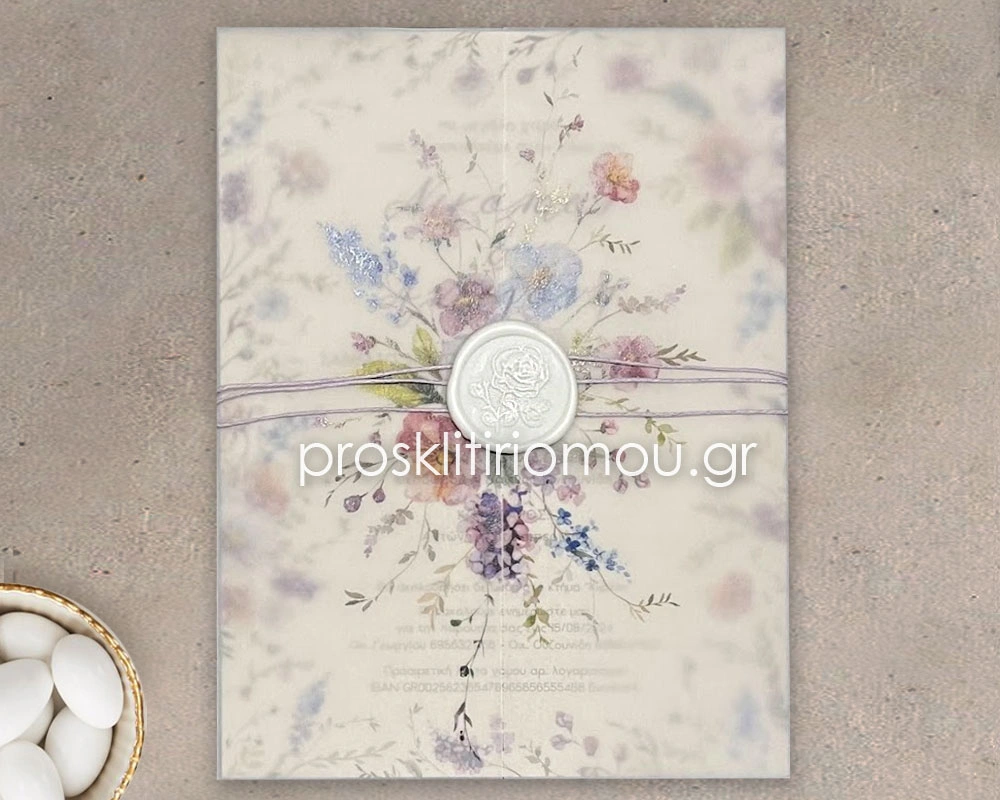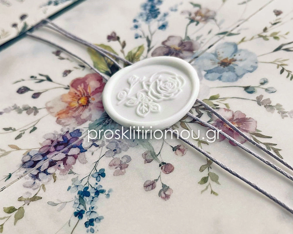 Προσκλητήριο ριζόχαρτο με λουλούδια 7814. Η εσωτερική κάρτα είναι από ματ premium χαρτί με έγχρωμη εκτύπωση. Εξωτερικά αντί για φάκελο το προσκλητήριο αγκαλιάζει ριζόχαρτο με εκτυπωμένα λουλούδια, κορδόνι και βουλοκέρι λευκό με ανάγλυφο σχέδιο λευκό τριαντάφυλλο.